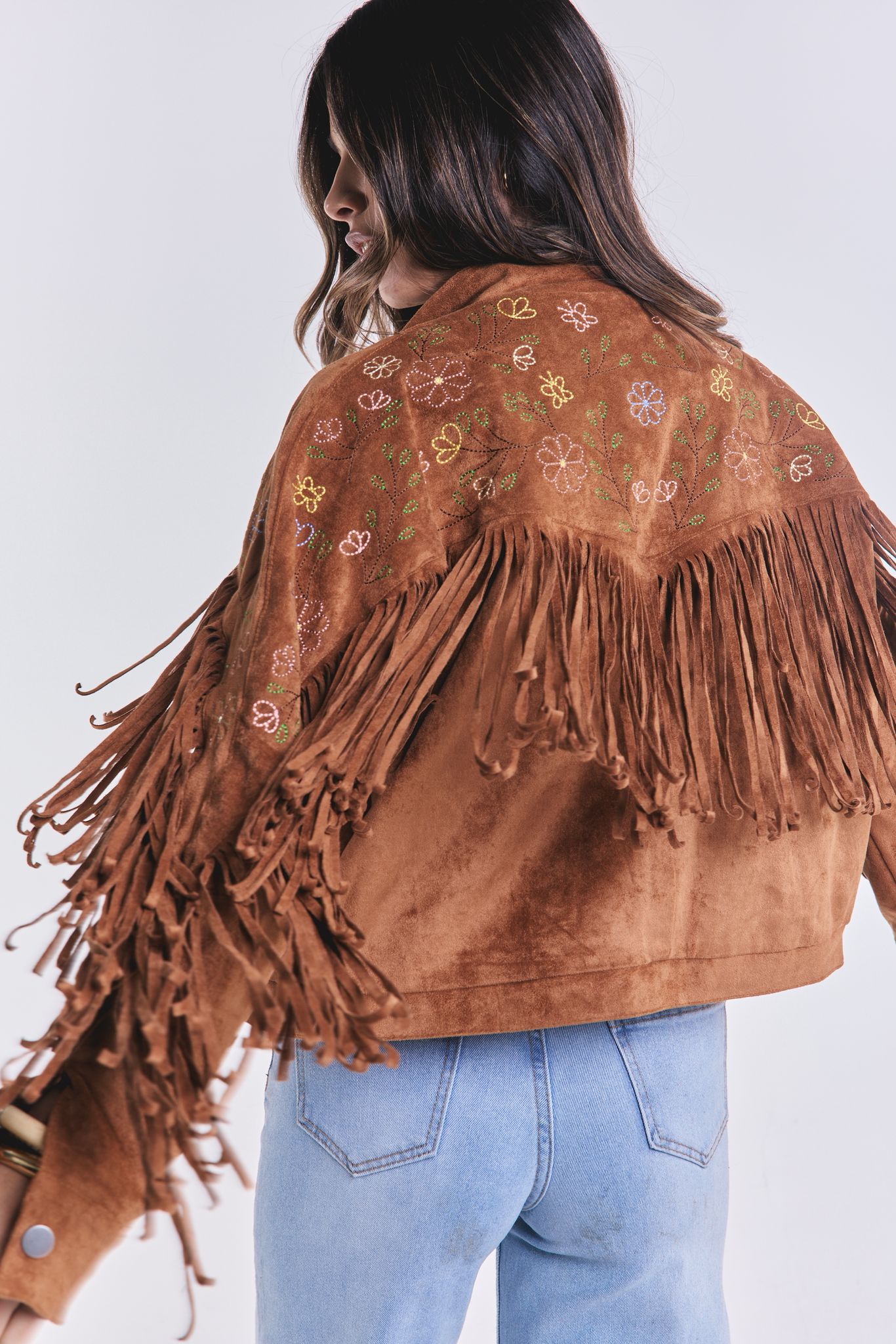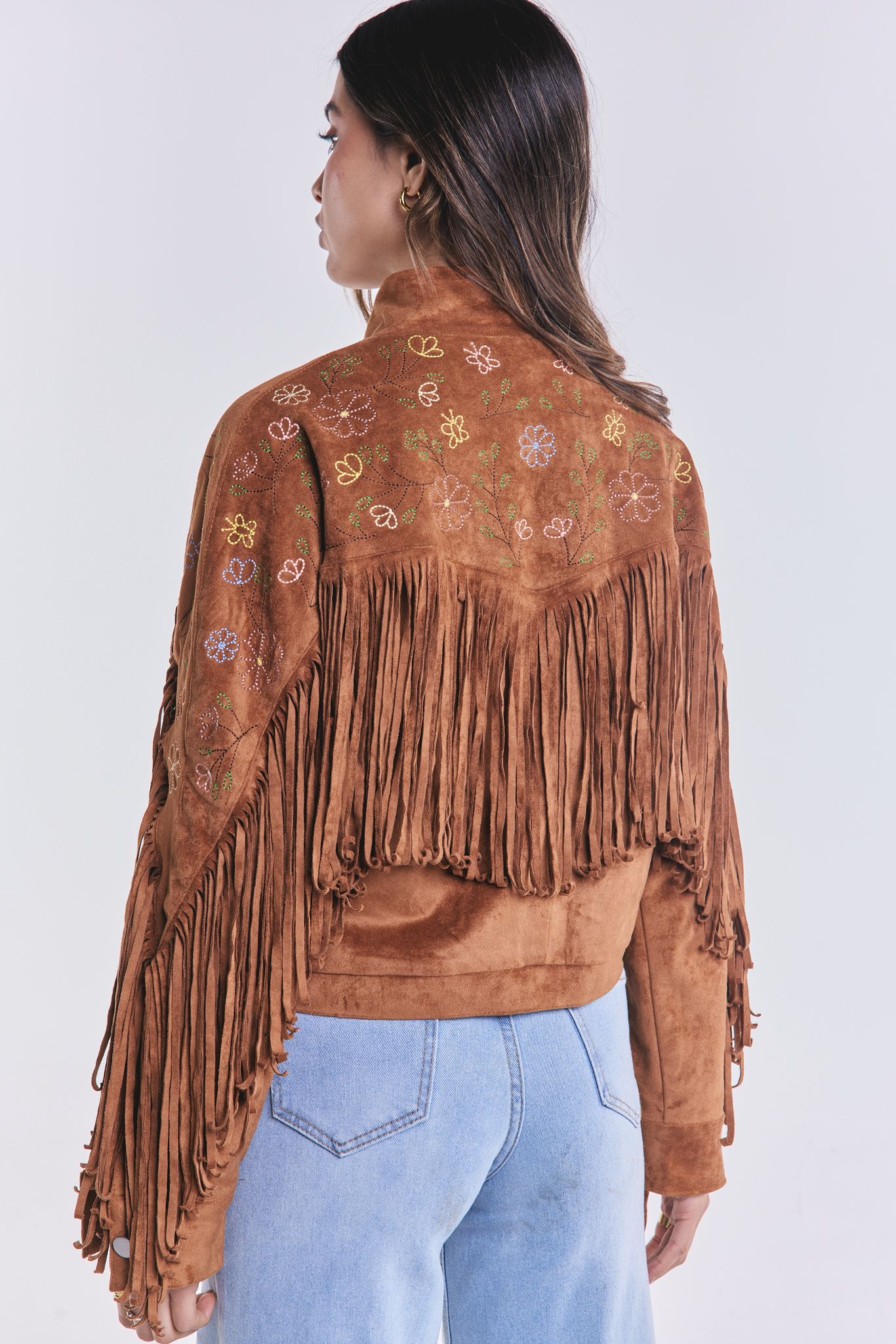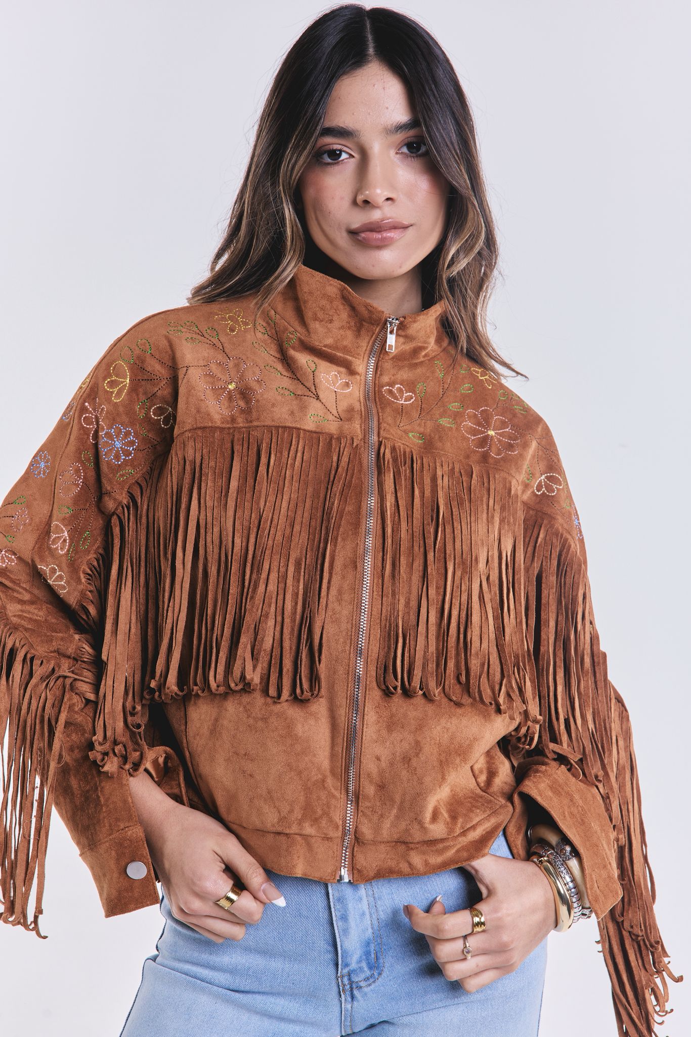 Campera de gamuza con flecos, y bordado de flores, con cierre cremallera. Es suelta.