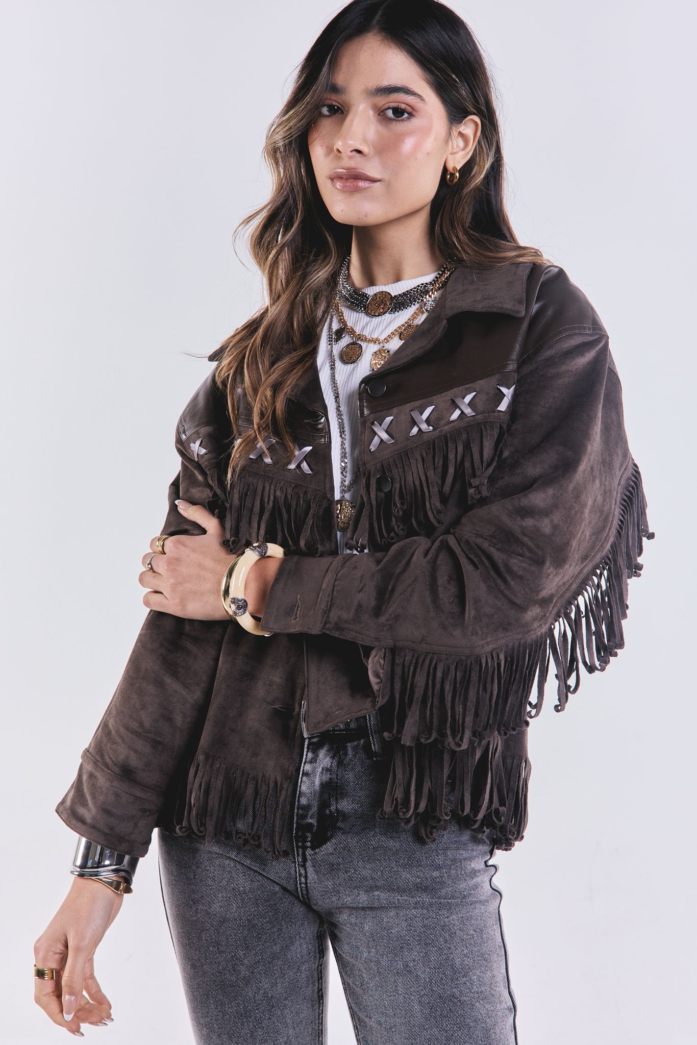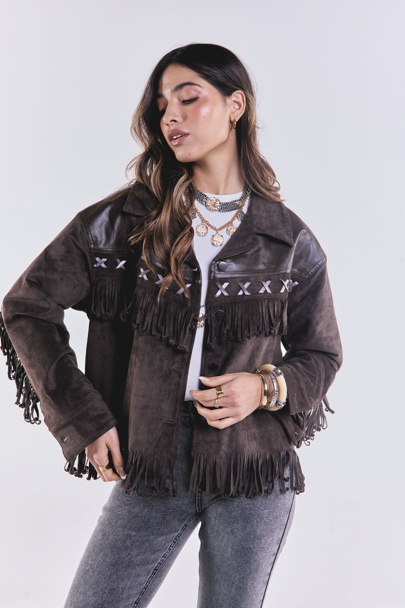 Campera de gamuza con flecos, y eco cuero en la parte superior. Es suelta.