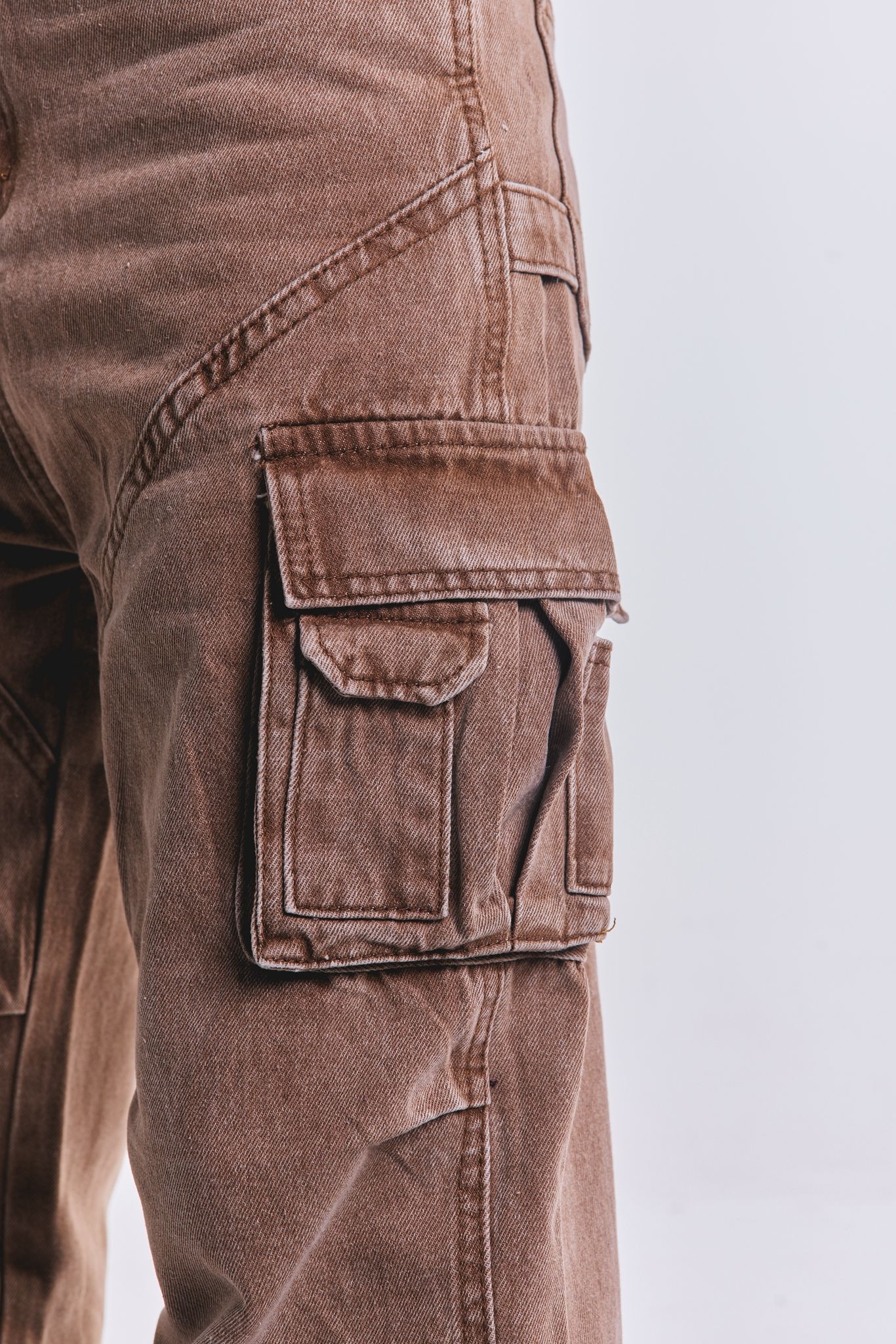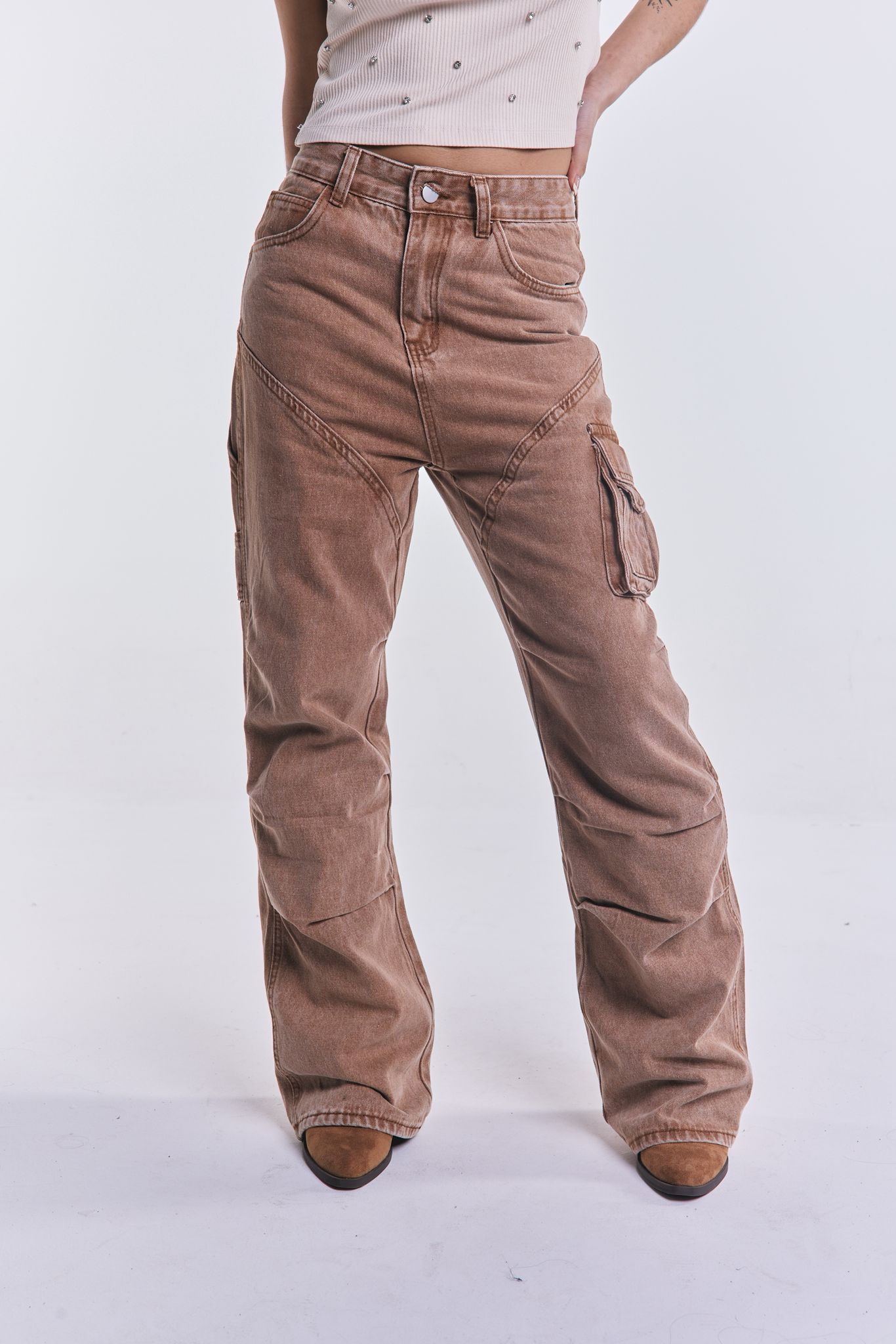 Denim cargo suelto, tiro medio, sin lycra.