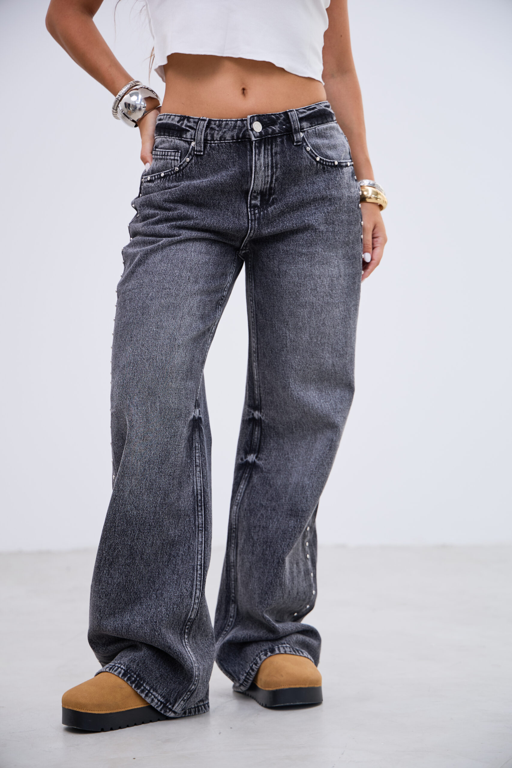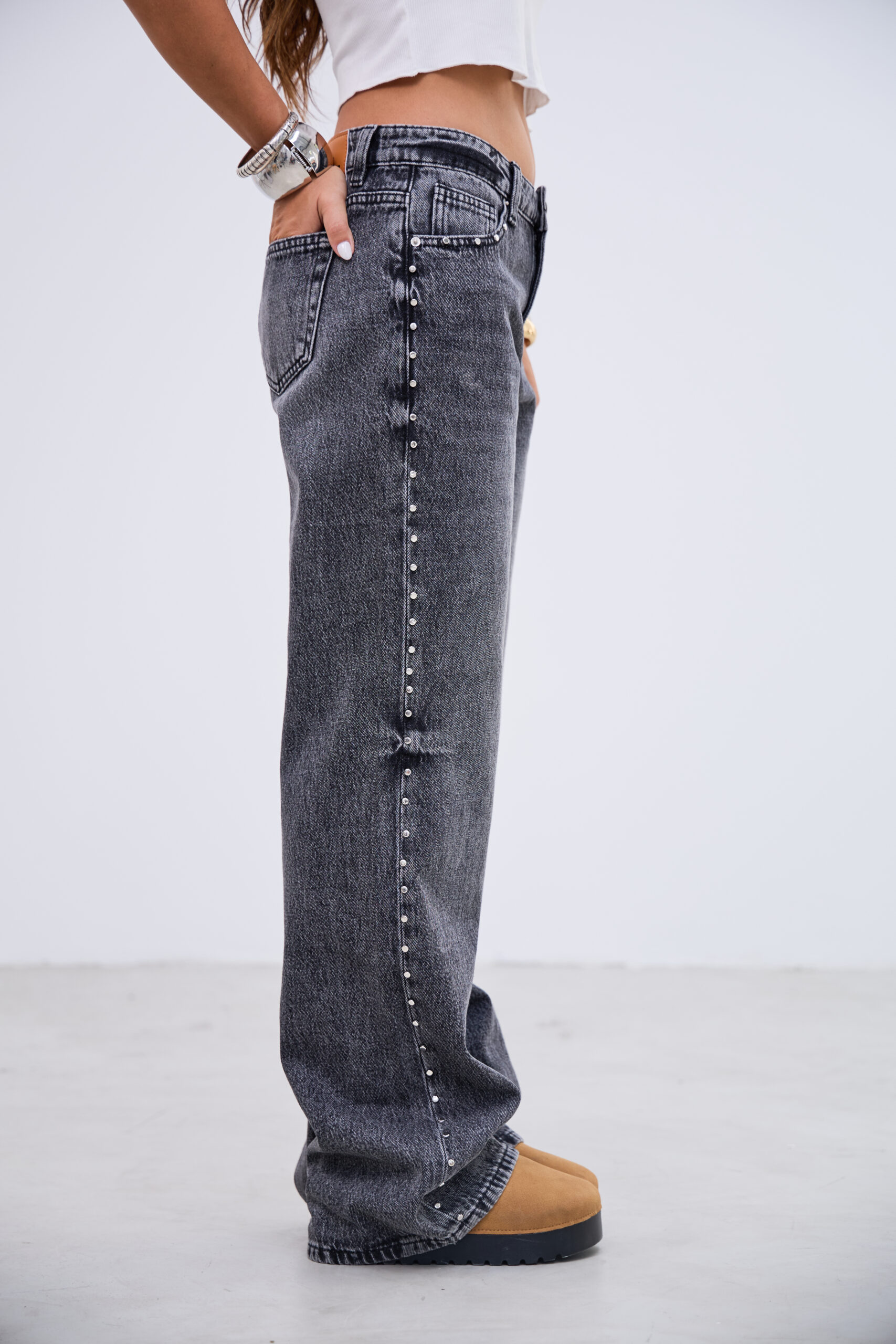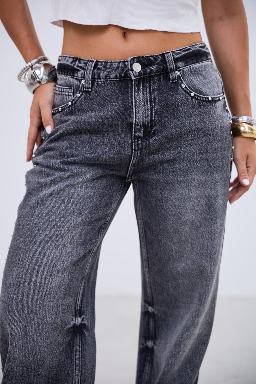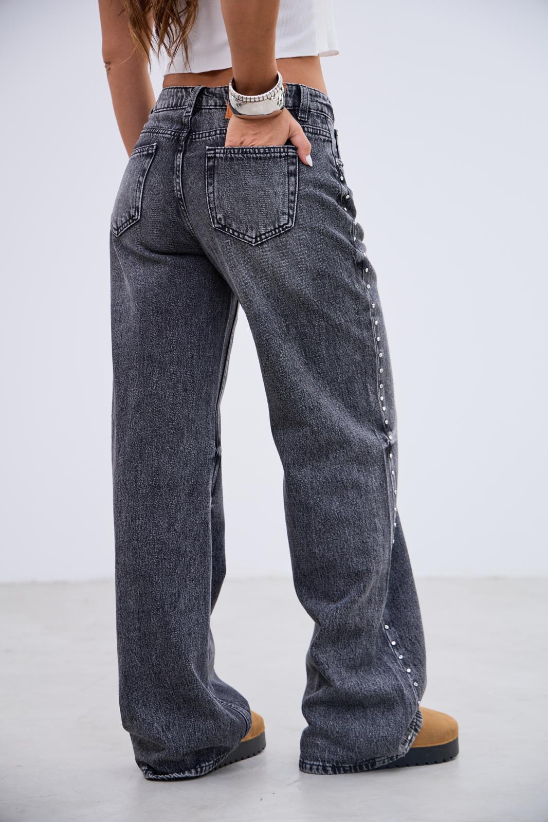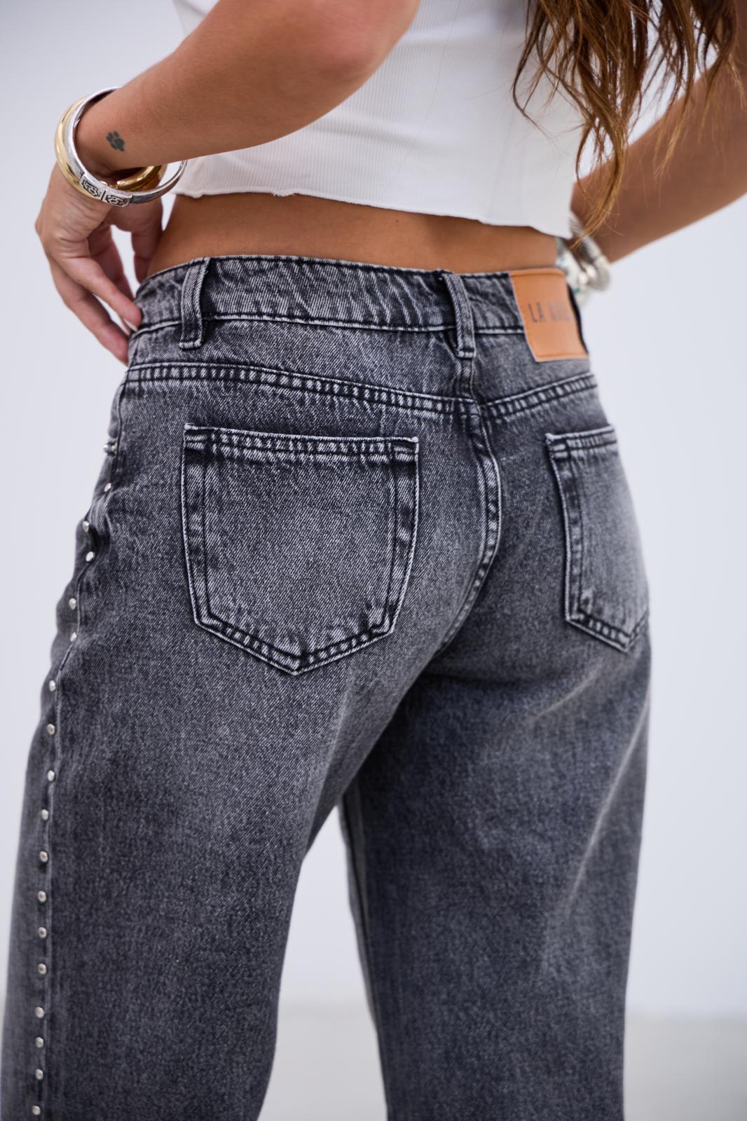 denim tiro medio,con tachas al costado, no tiene lycra.